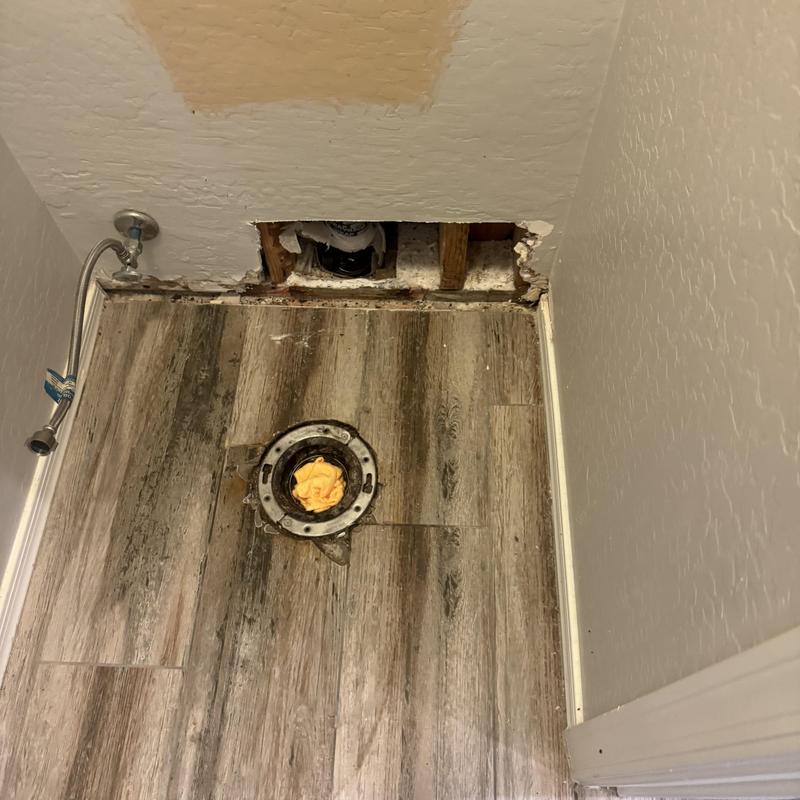 A plumber inspected a home in Litchfield Park, Arizona, and identified a toilet leak caused by a faulty wax ring. The leak led to flange corrosion and water damage to the surrounding drywall. The service involved diagnosing the issue and planning necessary repairs to both plumbing and damaged wall sections.