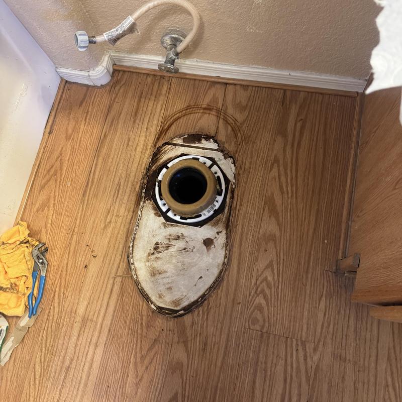 A plumber in Mesa, Arizona diagnosed a leaking toilet and found damage to the subfloor. The team removed the damaged section, replaced it, and prepared the area for resealing the toilet to prevent future leaks.